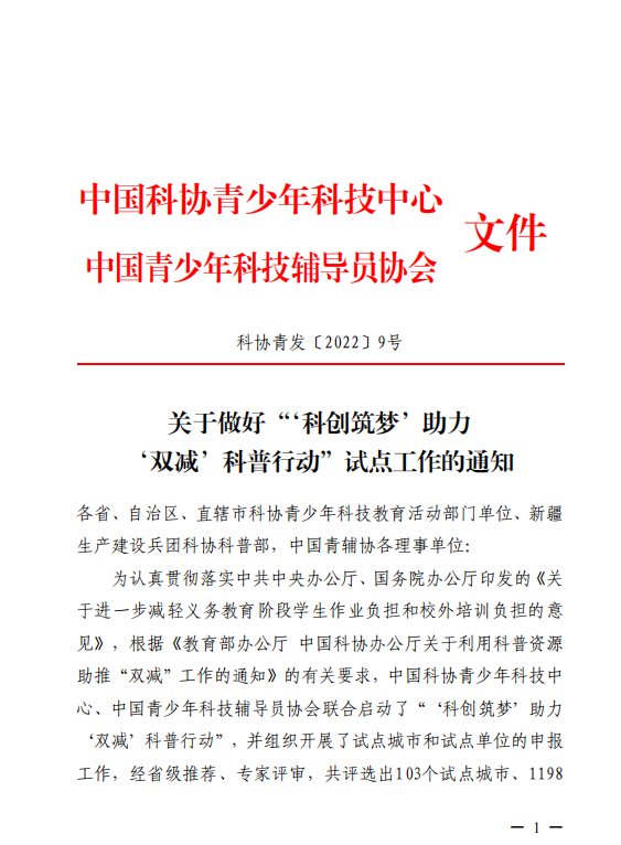 近日,中国科协青少年科技中心与中国青少年科技辅导员协会联合发文,公布了关于做好“‘科创筑梦’助力‘双减’科普行动”试点工作的通知(下文简称:通知),我校 “六艺”素质赋能馆经过评选成功入选试点单位。通知要求各试点单位要围绕“科教资源共建共享”“科技活动进校园”“科教阵地协同育人”“科技教师科学素质提升”“大手拉小手科技专家志愿服务”等五大科普行动,进一步探索科普工作下“科创筑梦”推动“双减”常态化的工作机制,努力形成利用科普资源助推“双减”可复制可推广的经验、做法和机制。