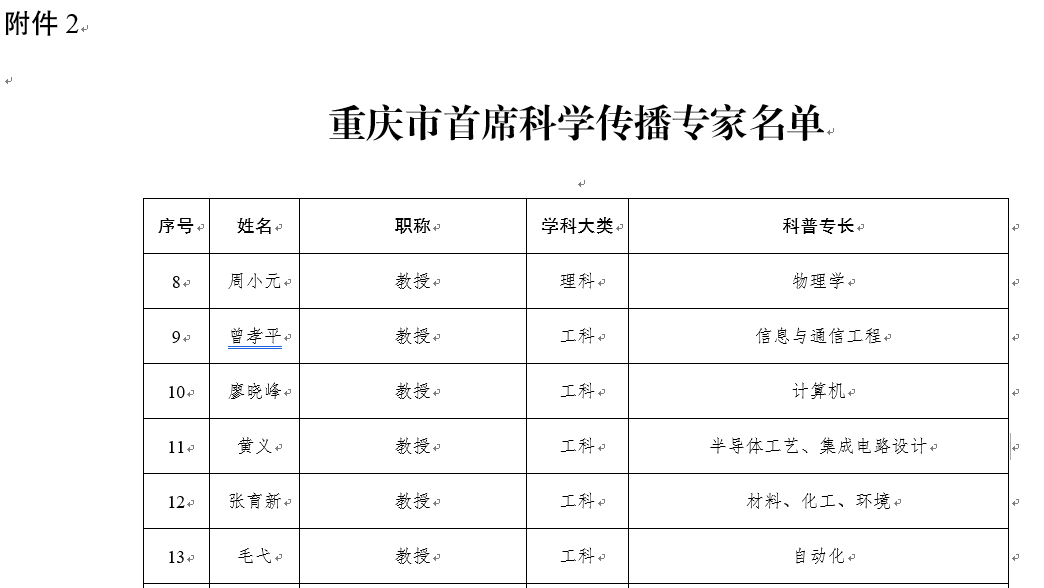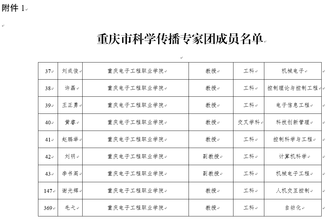 为贯彻落实《重庆市全民科学素质行动规划纲要实施方案(2021—2025年)》(渝府办发〔2021〕138号)精神,近日,在全市科技工作者中经择优推荐、资格审查、信息公示、会议审定等程序市科协发布了《关于公布重庆市科学传播专家团成员名单的通知》〔渝科协发(2022)55号〕,我校刘成俊、许磊、王正勇、谢光辉、黄睿、毛弋、赵鹏举、刘明、李书阁等9名教师被聘为新一批重庆市科学传播专家团成员,其中1名为首席科学传播专家,聘期三年。