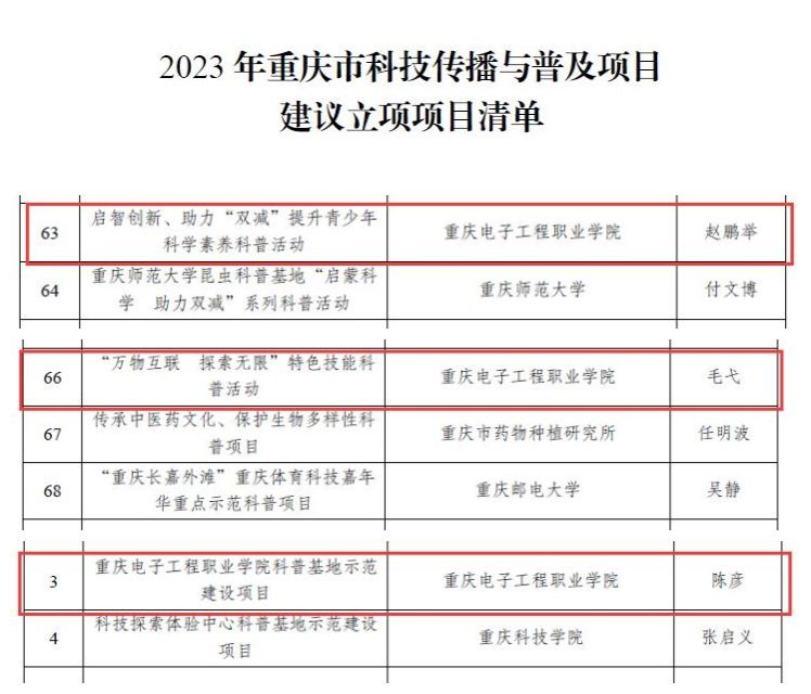 为深入贯彻落实《中共中央办公厅、国务院办公厅印发〈关于新时代进一步加强科学技术普及工作的意见〉的通知》精神,重庆市科技局近期开展了2023年度重庆市科技传播与普及项目的组织申报。经推荐评审,我校电子与物联网学院毛弋、智慧健康学院赵鹏举、陈彦三位教师成功立项2023年度重庆市科技传播与普及项目。