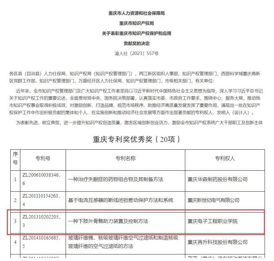 2023年12月27日,重庆市人力资源和社会保障局、重庆市知识产权局公布了首届重庆专利奖获奖名单,我校智慧健康学院谢光辉教授团队的科研成果《一种下肢外骨骼助力装置及控制方法》获首届重庆专利奖(全市仅有两所高校获奖)。该专利及其专利族群已应用于下肢运动功能障碍患者的康复训练,为推动我国康复工程学科建设、相关产业的科技进步及经济发展做出较大贡献,具有重大经济和社会效益。专利所属科研项目曾荣获重庆市科技进步二等奖。