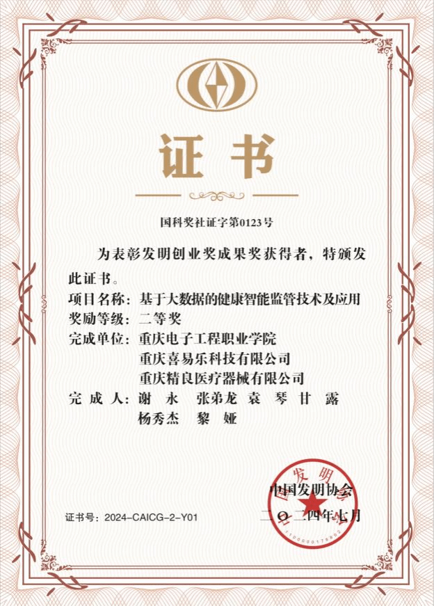 近日,中国发明协会公布了2024年度发明创业奖获奖名单。我校数字媒体学院谢永教授团队牵头,联合重庆喜易乐科技有限公司、重庆精良医疗器械有限公司,针对智慧健康领域疾病的预防与管理、患者监测与护理等难题共同完成的科研项目“基于大数据的健康智能监管技术及应用”获发明创业奖成果奖二等奖。