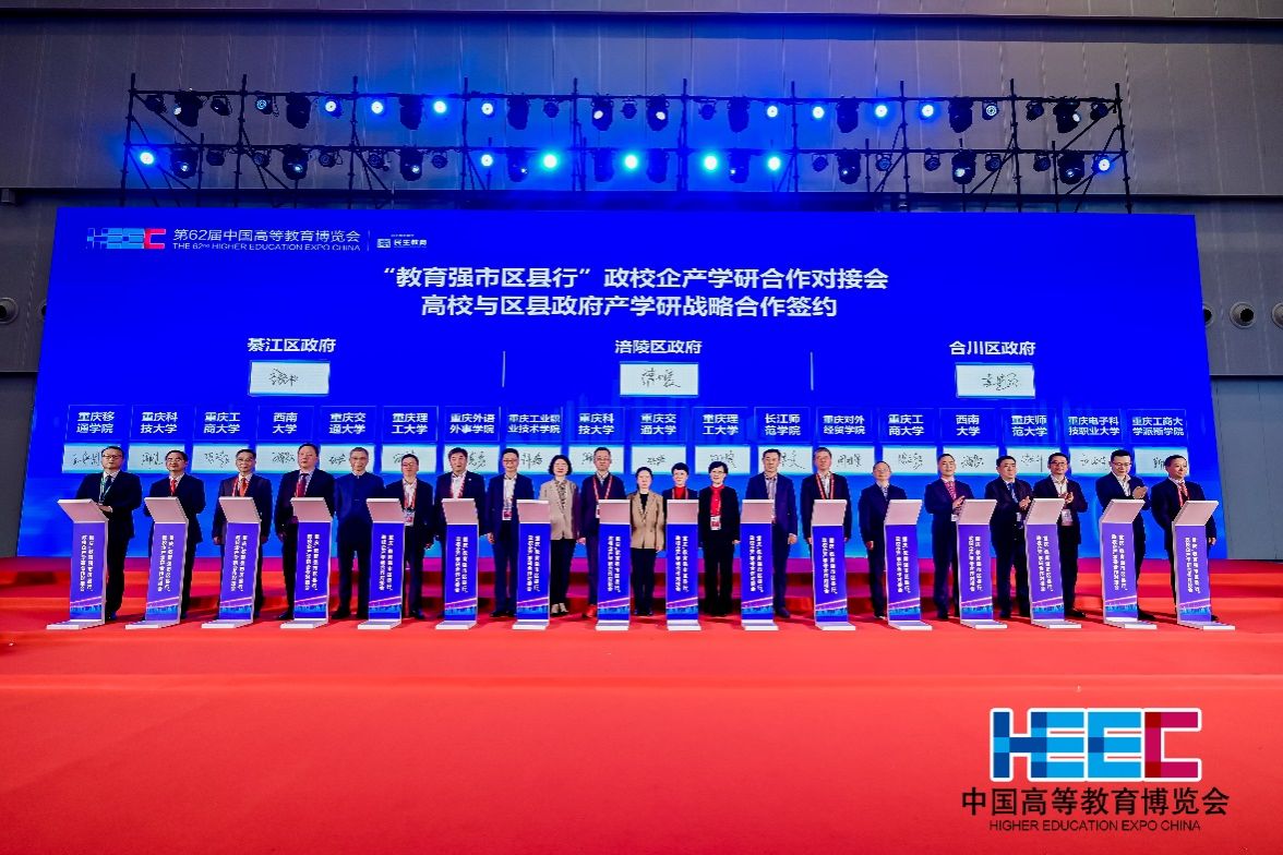 2024年11月16日,第62届中国高等教育博览会的重要环节--重庆“教育强市区县行”政校企产学研合作对接会在重庆国际博览中心中央大厅举行。此次对接会旨在深化政校企合作,推动产学研深度融合,促进区域经济社会发展。中国高等教育学会秘书长李楠、重庆市教育委员会副主任蒋云芳等分别致辞,相关区县领导、学校科研与社会服务处等相关人员参加会议。副校长刘成俊教授应邀出席会议并参与签约仪式。
